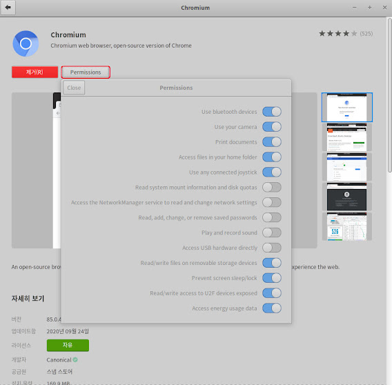 설치가 끝나면 Permission 이란 버튼이 보이는데요. snap 프로그램들은 가상환경에서 실행됩니다. 따라서 접근 권한에 대한 설정이 있습니다. 잘 모르시면 특별한 일 없으면 건드리실 필요는 없습니다. 일반적으로 프로그램 실행에 필요한 권한은 다 설정 되어 있는게 보통입니다.